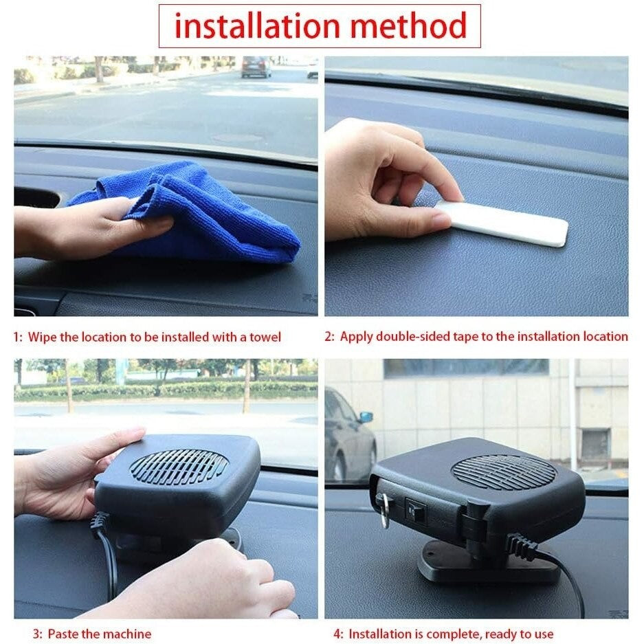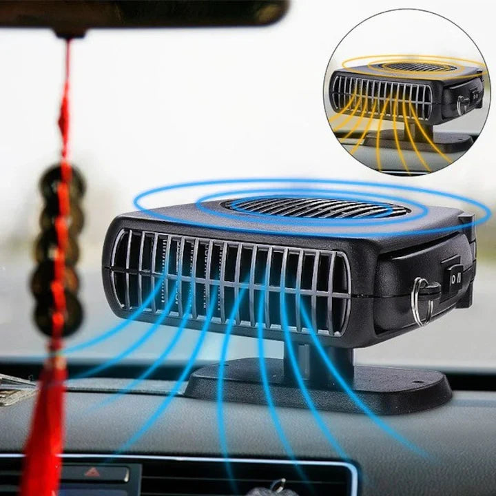 Fixează pe bord, conectează la brichetă (12V), alege modul (cald/rece) și orientează aerul.